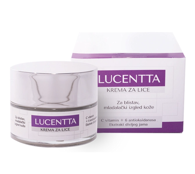 Tajna naše kreme je zasnovan na izolovanom C vitaminu, 6 antioksidanasa i ekstraktu prirodnog divljeg jama. Ceo njen sastav stimuliše proizvodnju prirodnog kolagena, smanjuje bore, vraća elastičnost koži i učvršćuje konture lica. A pritom, nema nikakvih dodatnih hemijskih sastava (neželjenih efekata). Lucentta je u potpunosti zasnovana na 100% prirodnom sastavu!